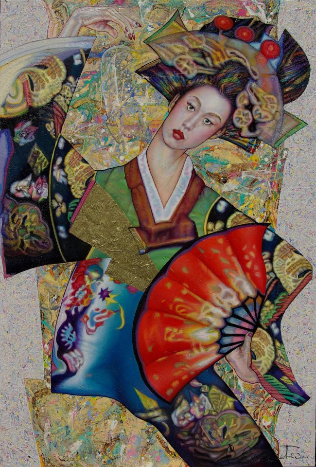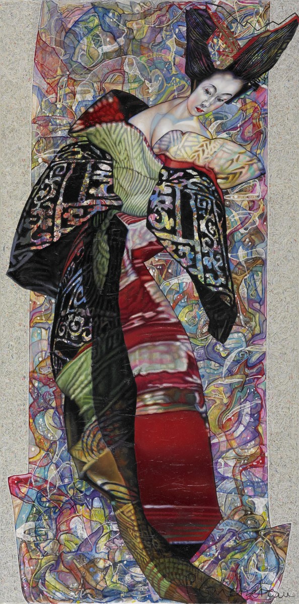 Si l’artiste ne veut pas donner une identité propre à sa représentation centrale, c’est qu’il l’ « entend » donc (elle résonne / raisonne ainsi en lui) essentiellement comme une « chimère » forgée par cet acte pictural. Une peinture qui, physiquement, vient du fond de la toile vers la surface de la représentation avec toutes les étapes techniques intermédiaires possibles. D’abord l’artiste enduit la toile au couteau avec des épaisseurs incorporant même du sable, du gel ou de la feuille d’or (ceci forme un lien évident avec ses sculptures actuelles traitant de la même thématique, peintes au recto et dorées au verso), tout cela donnant un relief, une dynamique supplémentaire aux formes et couleurs qui vont venir se superposer ensuite. Le traitement purement pictural est d’abord effectué à l’acrylique, de façon à ébaucher les formes, puis enfin parachevé à l’huile. Alors tout est repris en gestes plus amples avec des circonvolutions qui peuvent venir heurter, en de multiples interactions, d’autres lignes plus dures, ou encore avec des entrelacs de formes qui s’articulent avec d’autres, de couleurs, l’Abstraction devenant, dans les dernières œuvres, de plus en plus présente. Mais ceci toujours de façon à déranger l’œil du « regardeur » (comme disait Duchamp) afin de le surprendre, comme en musique, lorsqu’une mélodie est soudainement déchirée par le son d’instruments poussés à fond ou, au contraire, par de soudains silences.