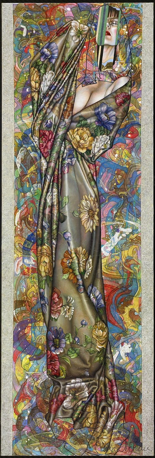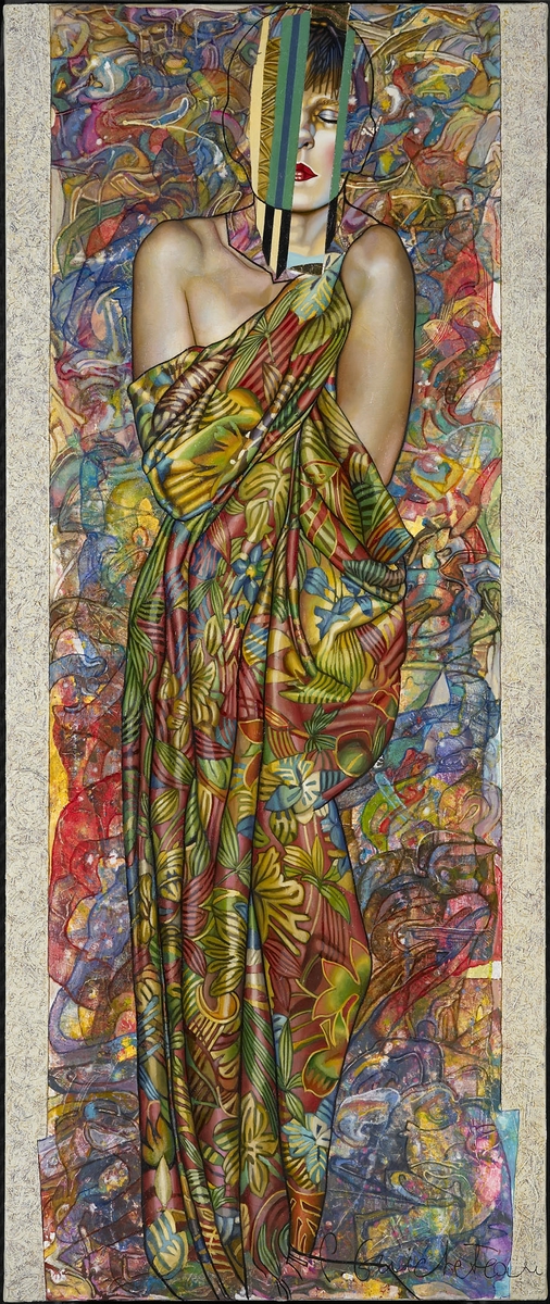 De plus, on peut dire de la figure de la femme, omniprésente dans cette dernière période de l’artiste, qu’elle éclot « comme une fleur » dans l’omniprésence de toutes les autres fleurs qui inondent les drapés sertissant ces femmes. Elle devient ainsi non seulement une évocation de LA femme, mais aussi une représentation allégorique de l’unité à l’infini et, dans notre synesthésie, de la note à la symphonie. Elle est comme un écho musical (la « Musique des sphères » chère à l’astrophysicien Képler) du fini de l’Etre face à l’infini de l’Univers. Cette œuvre, par-delà la personnalisation du corps (animal ou humain, mais toujours confronté au « corps » de la peinture…) montre que le réalisme des êtres et des personnalités n’est qu’apparence (les barres « codées » des visages…) et que la femme (puisqu’il s’agit essentiellement d’elle) est bien une métaphore de la Création, donc de la Vie. Mais ici, cette création n’est pas une illusion recherchée de la Réalité ; elle est la monstration des moyens de sa réalisation et le questionnement des finalités de cette Création. Une création qui joue, comme le dit l’artiste, sur « une interférence entre le réel et l’indicible ».