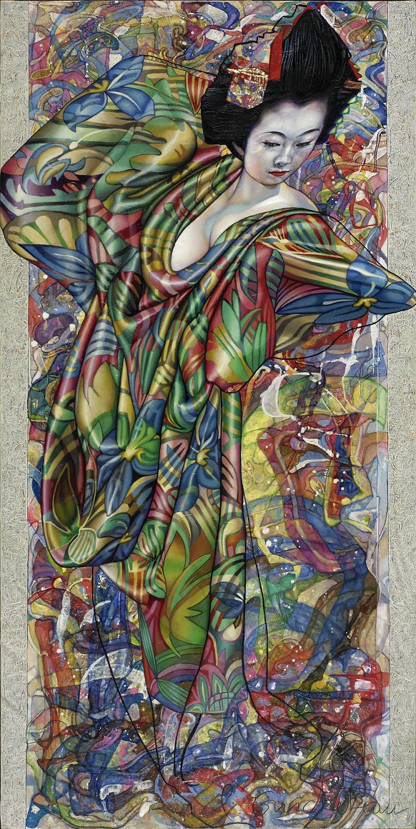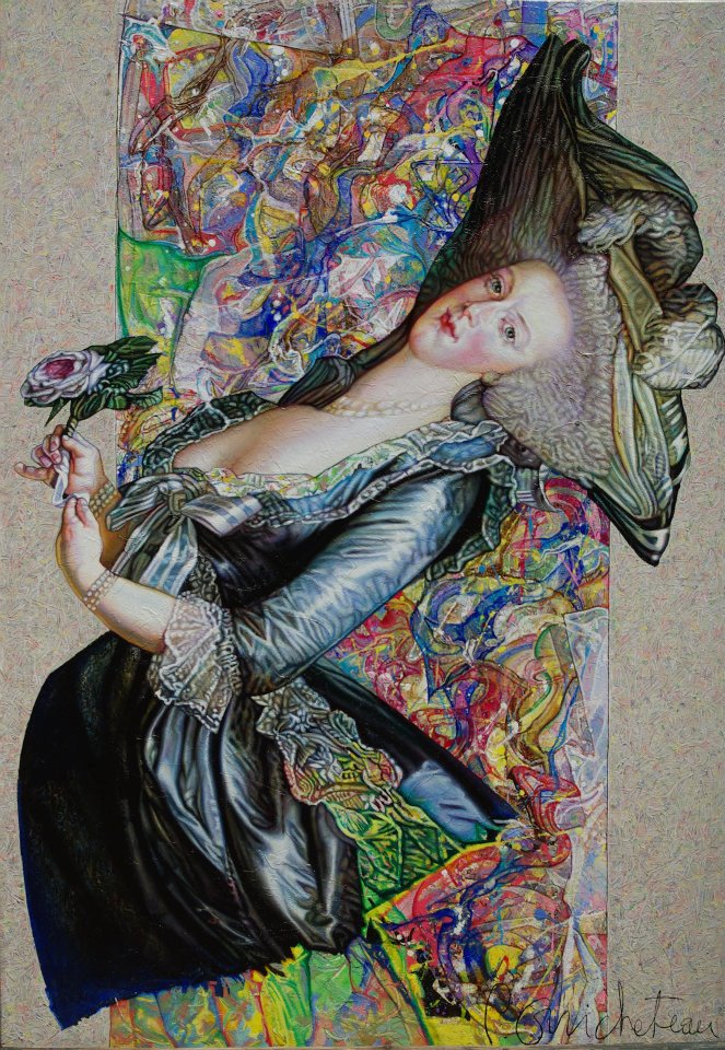 Si l’artiste ne veut pas donner une identité propre à sa représentation centrale, c’est qu’il l’ « entend » donc (elle résonne / raisonne ainsi en lui) essentiellement comme une « chimère » forgée par cet acte pictural. Une peinture qui, physiquement, vient du fond de la toile vers la surface de la représentation avec toutes les étapes techniques intermédiaires possibles. D’abord l’artiste enduit la toile au couteau avec des épaisseurs incorporant même du sable, du gel ou de la feuille d’or (ceci forme un lien évident avec ses sculptures actuelles traitant de la même thématique, peintes au recto et dorées au verso), tout cela donnant un relief, une dynamique supplémentaire aux formes et couleurs qui vont venir se superposer ensuite. Le traitement purement pictural est d’abord effectué à l’acrylique, de façon à ébaucher les formes, puis enfin parachevé à l’huile. Alors tout est repris en gestes plus amples avec des circonvolutions qui peuvent venir heurter, en de multiples interactions, d’autres lignes plus dures, ou encore avec des entrelacs de formes qui s’articulent avec d’autres, de couleurs, l’Abstraction devenant, dans les dernières œuvres, de plus en plus présente. Mais ceci toujours de façon à déranger l’œil du « regardeur » (comme disait Duchamp) afin de le surprendre, comme en musique, lorsqu’une mélodie est soudainement déchirée par le son d’instruments poussés à fond ou, au contraire, par de soudains silences.