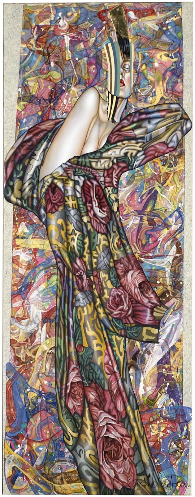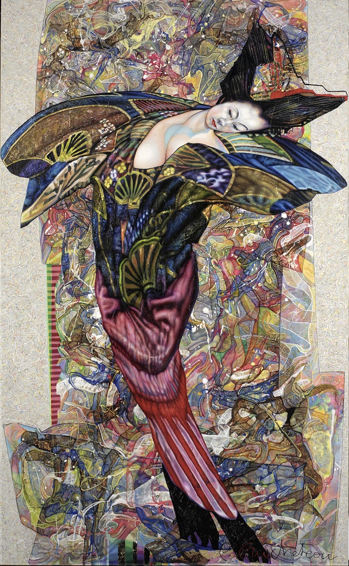 De plus, on peut dire de la figure de la femme, omniprésente dans cette dernière période de l’artiste, qu’elle éclot « comme une fleur » dans l’omniprésence de toutes les autres fleurs qui inondent les drapés sertissant ces femmes. Elle devient ainsi non seulement une évocation de LA femme, mais aussi une représentation allégorique de l’unité à l’infini et, dans notre synesthésie, de la note à la symphonie. Elle est comme un écho musical (la « Musique des sphères » chère à l’astrophysicien Képler) du fini de l’Etre face à l’infini de l’Univers. Cette œuvre, par-delà la personnalisation du corps (animal ou humain, mais toujours confronté au « corps » de la peinture…) montre que le réalisme des êtres et des personnalités n’est qu’apparence (les barres « codées » des visages…) et que la femme (puisqu’il s’agit essentiellement d’elle) est bien une métaphore de la Création, donc de la Vie. Mais ici, cette création n’est pas une illusion recherchée de la Réalité ; elle est la monstration des moyens de sa réalisation et le questionnement des finalités de cette Création. Une création qui joue, comme le dit l’artiste, sur « une interférence entre le réel et l’indicible ».